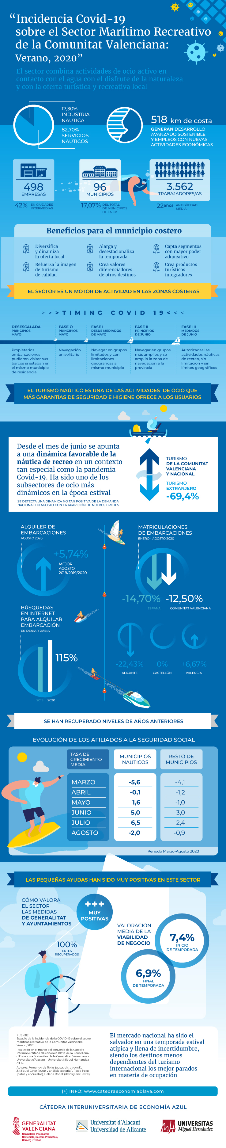 La Càtedra d’Economia Blava i del Sector Marítim Recreatiu de la Conselleria d’Economia Sostenible de la Generalitat Valenciana-Universitat d’Alacant-Universitat Miguel Hernández presentó en el período de 2020 un programa de actividades adecuado a las circunstancias excepcionales que la economía y la salud pública se han encontrado debido a la pandemia por Covid-19.